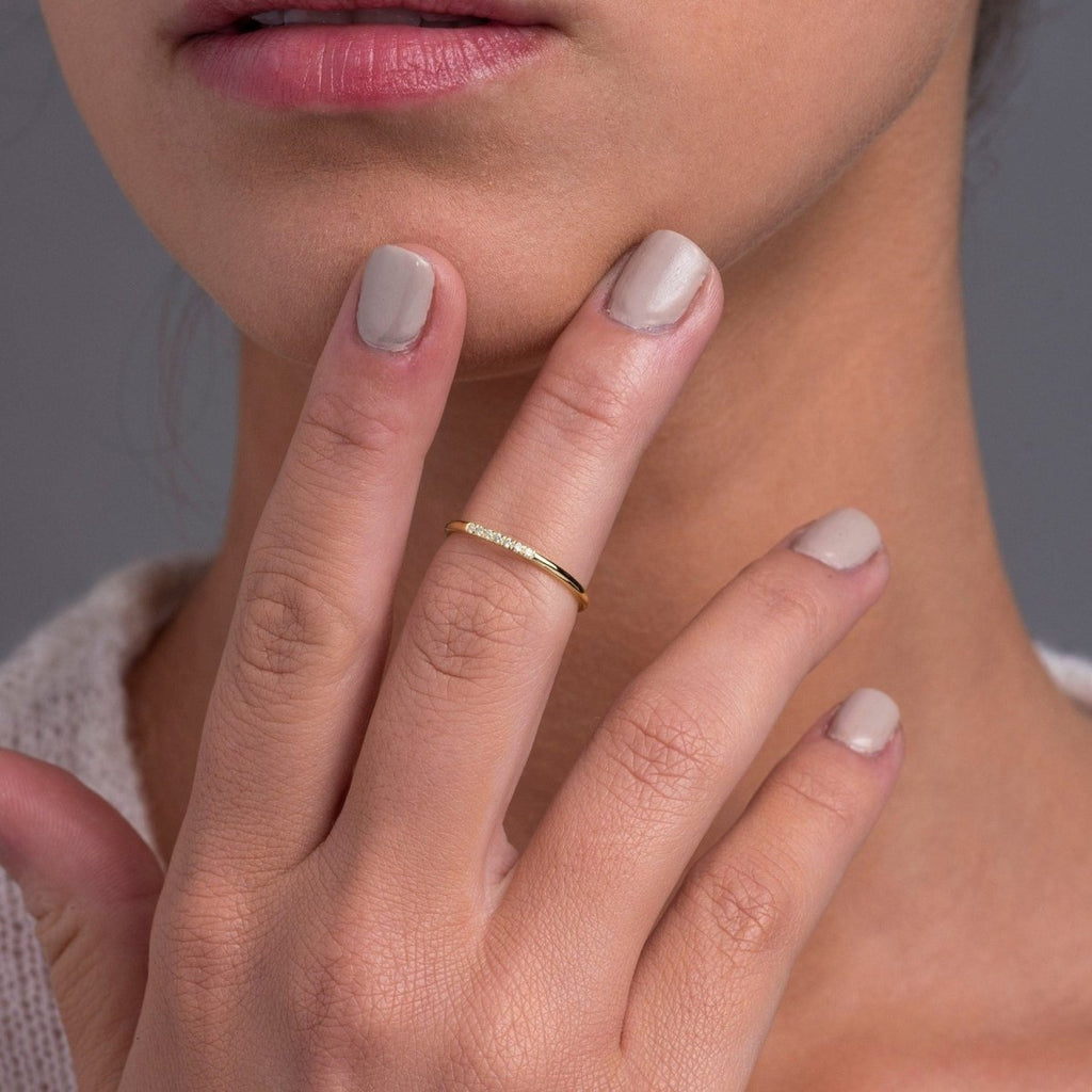 ✦ Cherish your love story with this captivating Thin Stacking band, adorned with 0.066 TCW Round Cut Moissanites that shimmer with brilliance and grace.