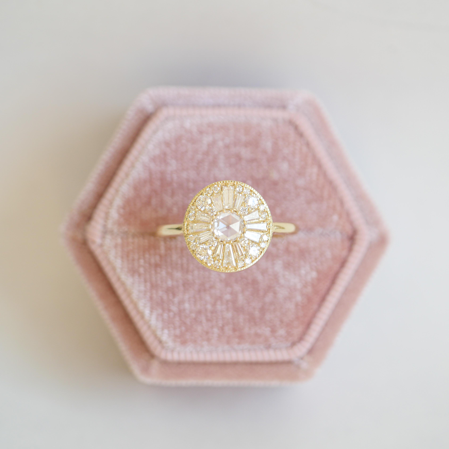 ✦ Discover vintage allure with this captivating mosaic ring, where Round & Baguette Moissanite stones unite in a dazzling Art Deco design that radiates sophistication.