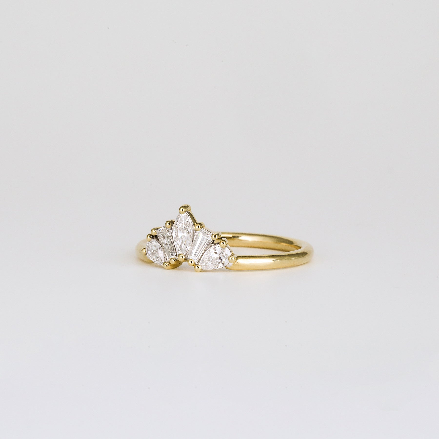 ✦ The Band Displayed in the Image Highlights a 0.45 TCW Marquise, Baguette & Pear CVD Diamond Chevron Crown Wedding Band.