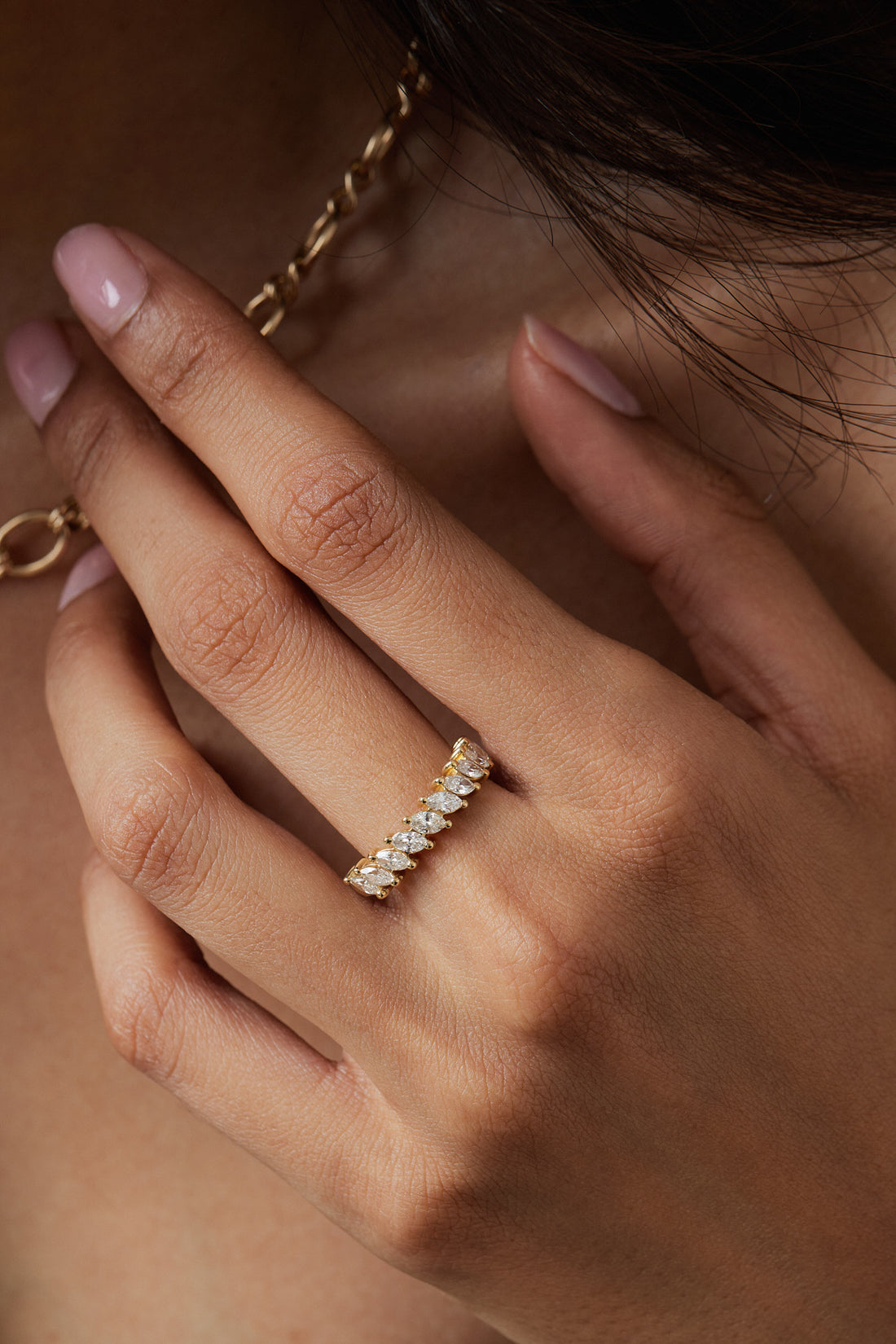 ✦ Cherish your love story with this captivating Half Eternity band with Shared Prong, adorned with 0.99 TCW Marquise Cut Moissanites that shimmer with brilliance and grace.