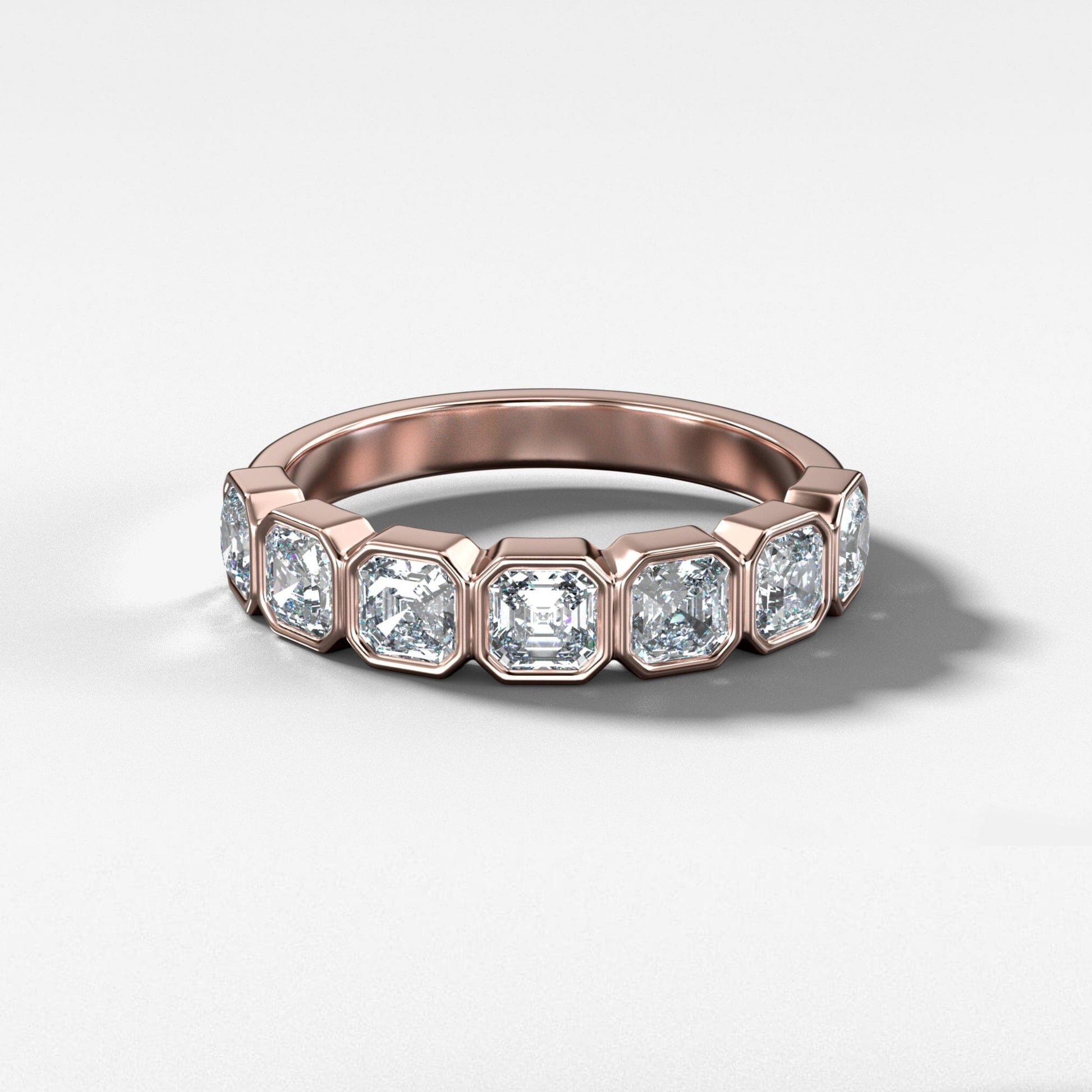 ✦ The Band Displayed in the Image Highlights a 1.05 TCW Asscher CVD Diamond Half Eternity Bezel Set Wedding Band.