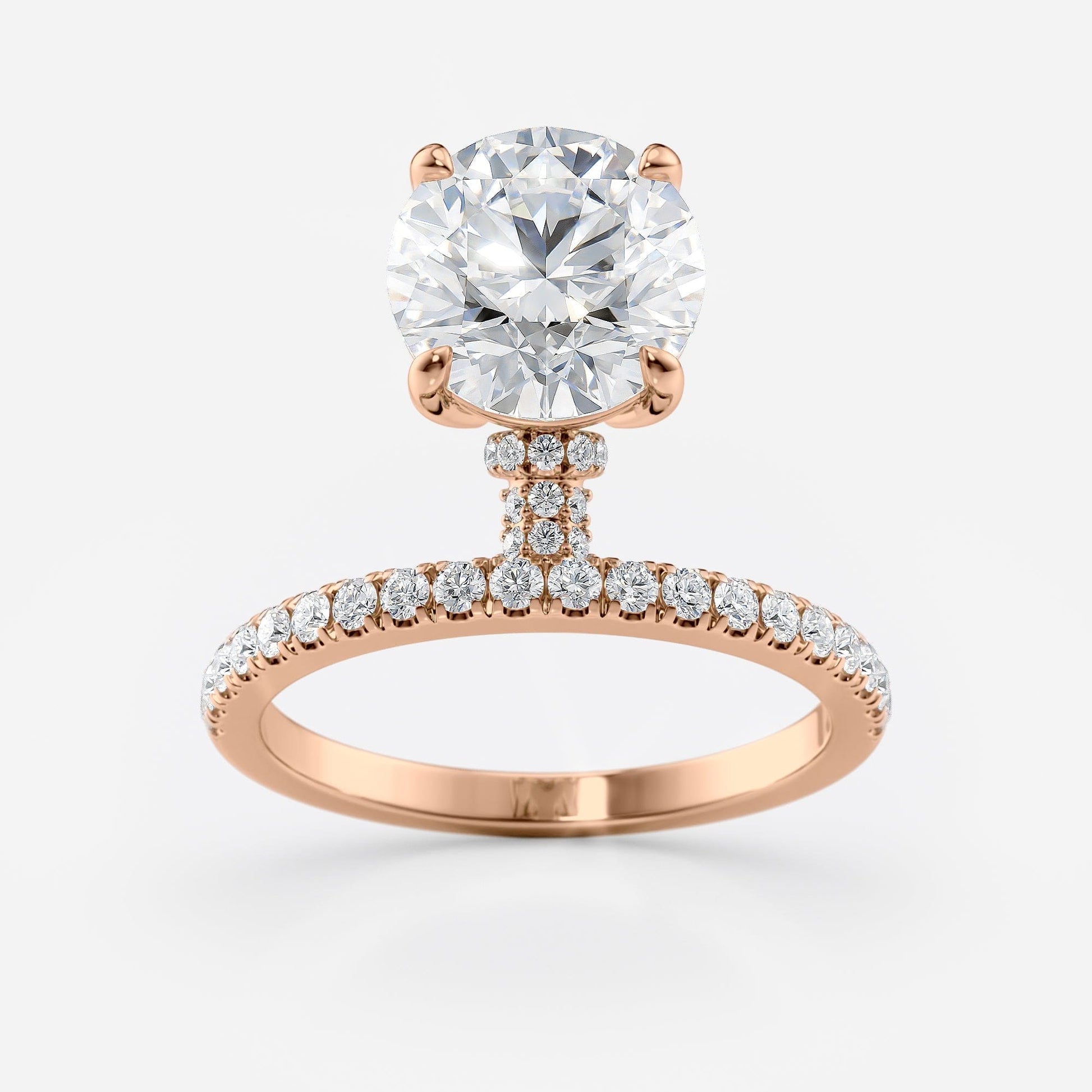 ✦ Cherish your love story with this captivating Hidden Halo ring with Dainty Pave Band, centered around a 1.5 - 2.5 CT Round Moissanite that shimmers with brilliance.