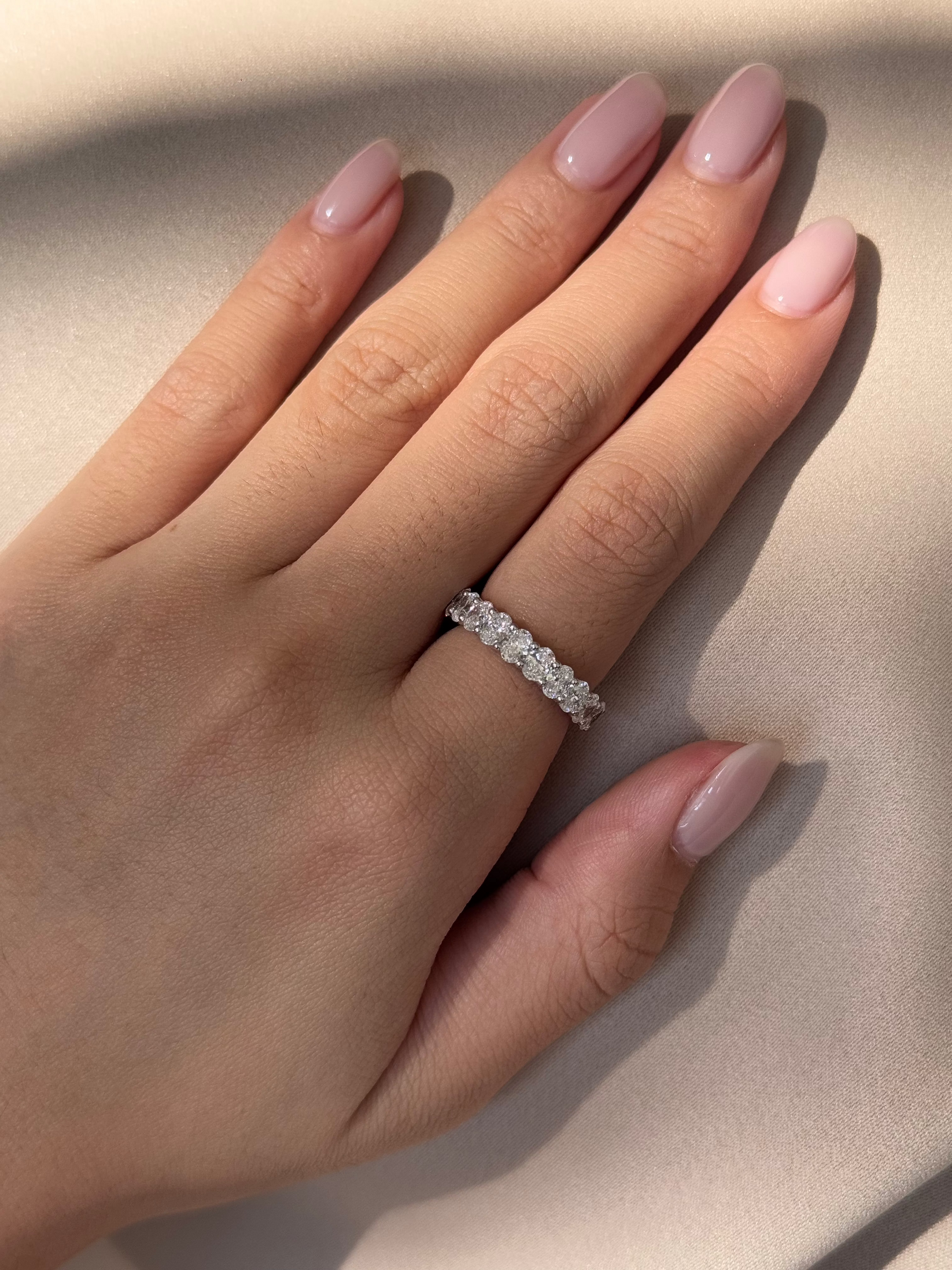 ✦ The Band Displayed in the Image Highlights a 1.67 TCW Oval CVD Diamond Half Eternity with Shared Prong Wedding Band.