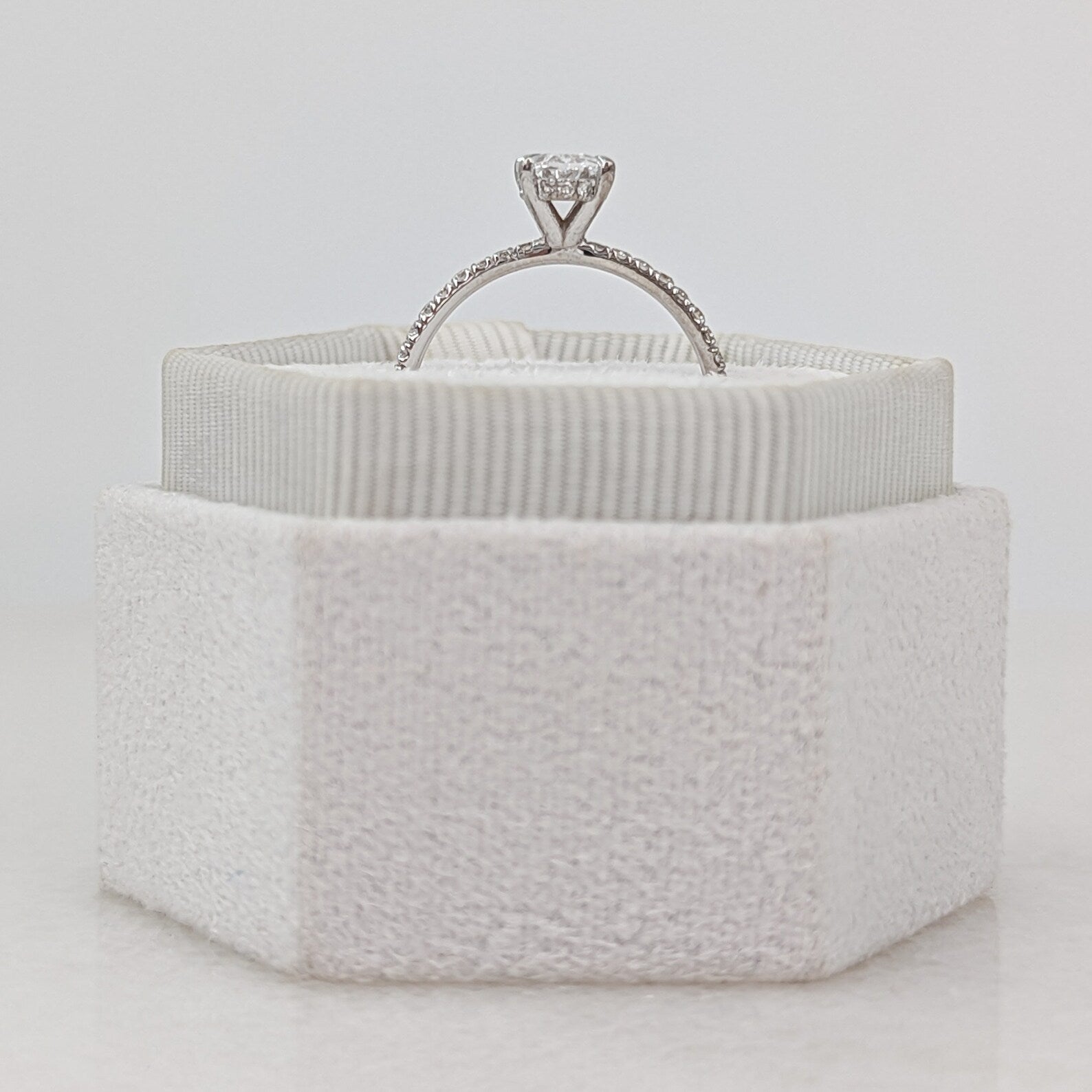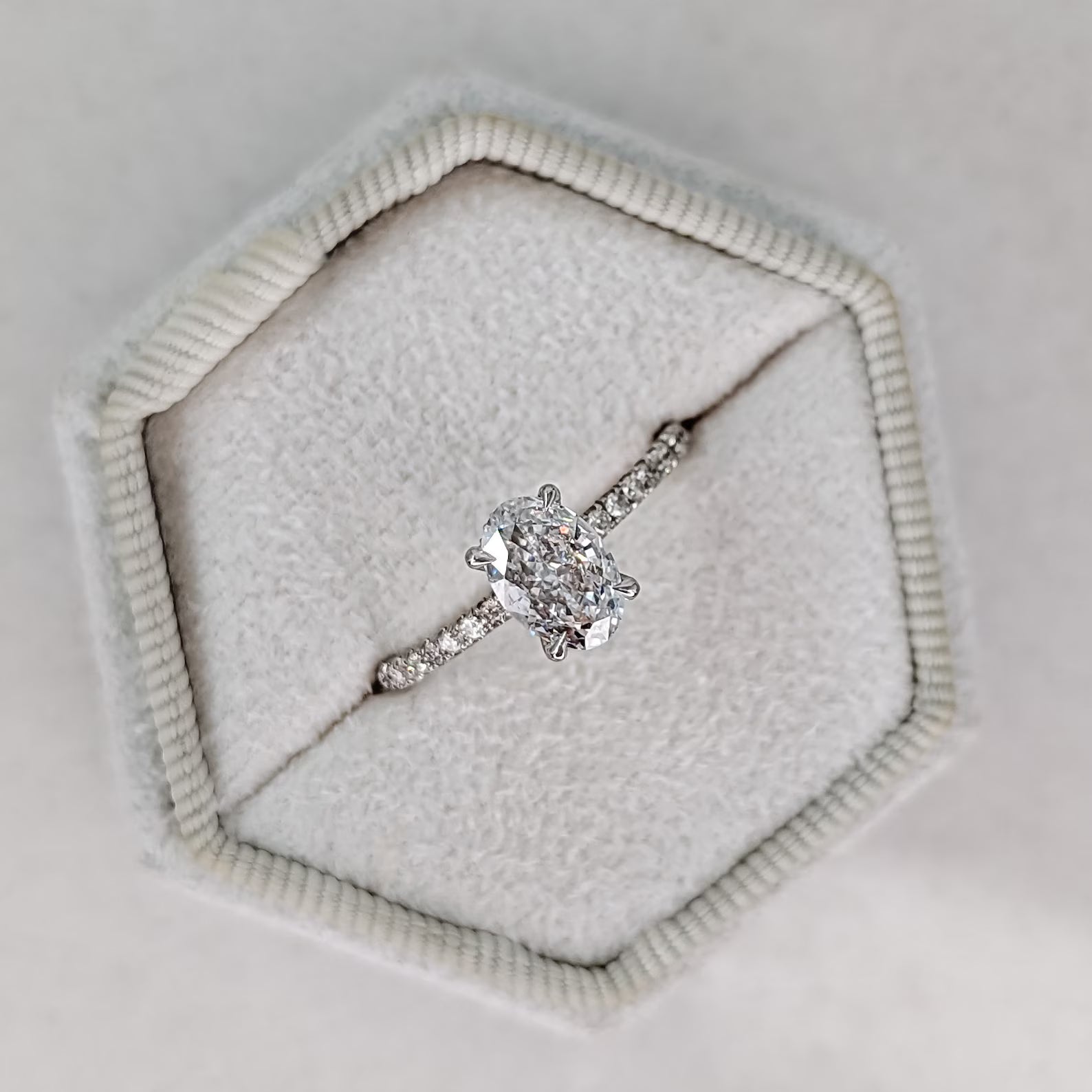 ✦ Cherish your love story with this captivating Hidden Halo ring with Pave Setting, centered around a 1 CT Oval Moissanite that shimmers with brilliance.