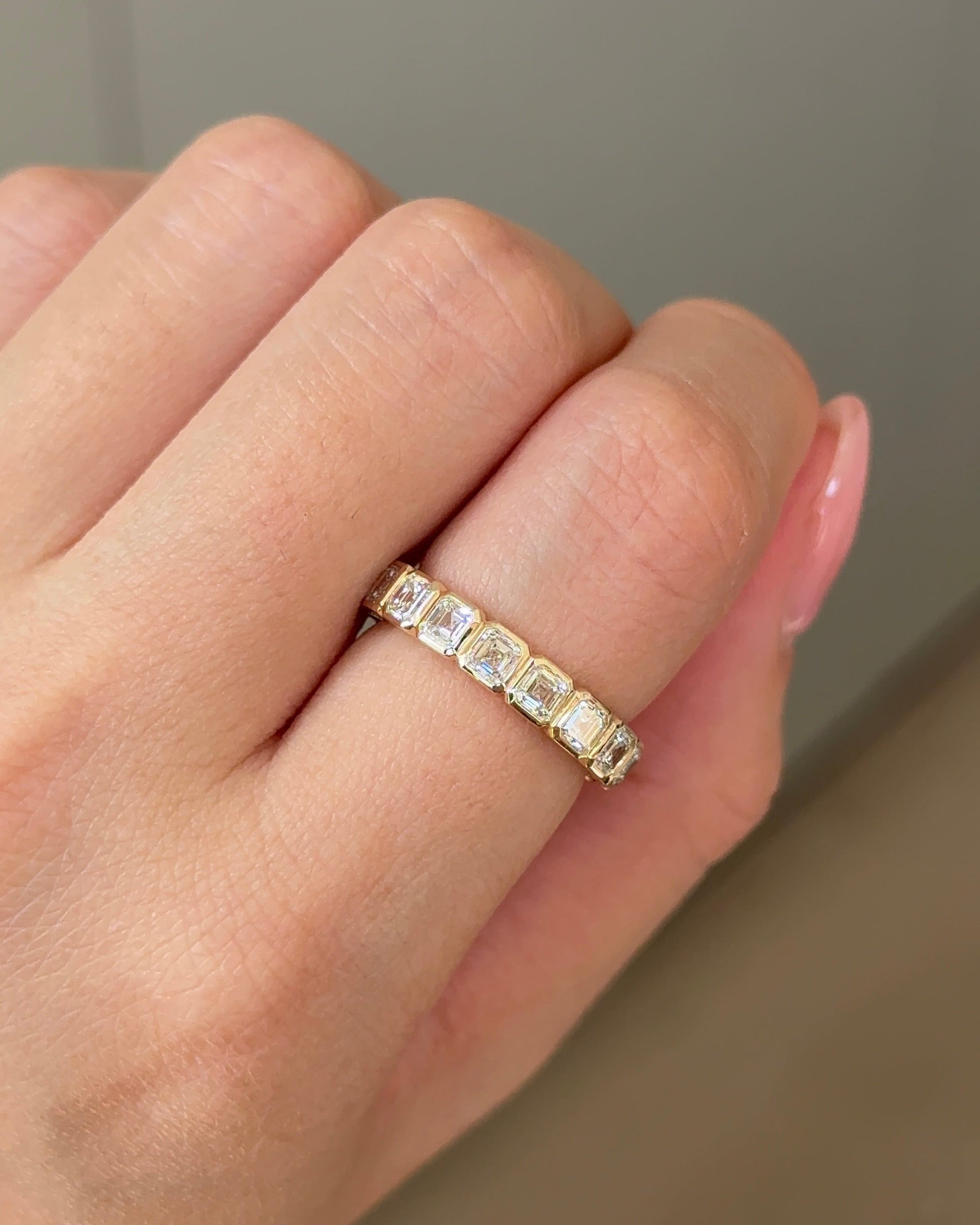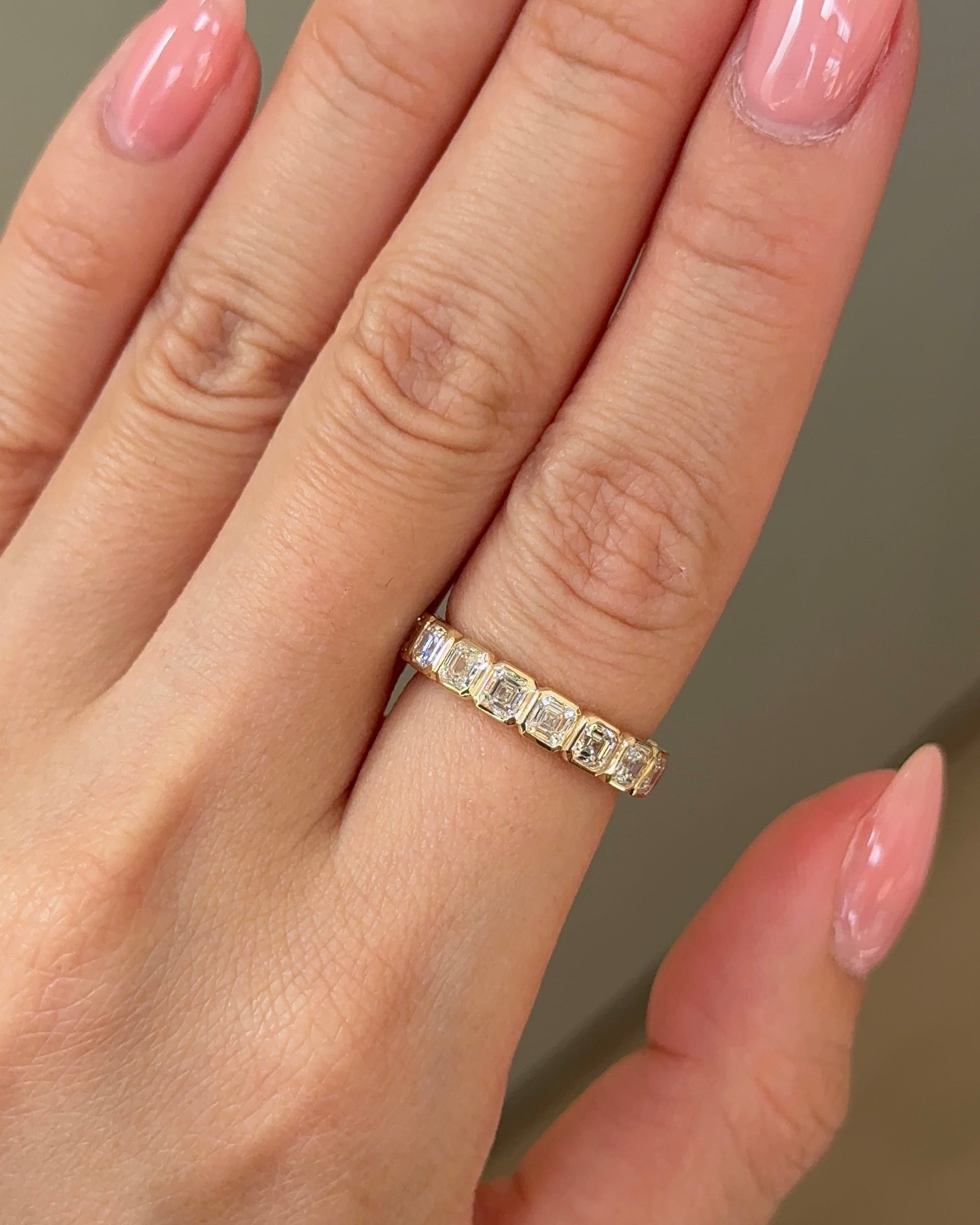 ✦ The Band Displayed in the Image Highlights a 2.09 TCW Asscher CVD Diamond Half Eternity with Bezel Wedding Band.