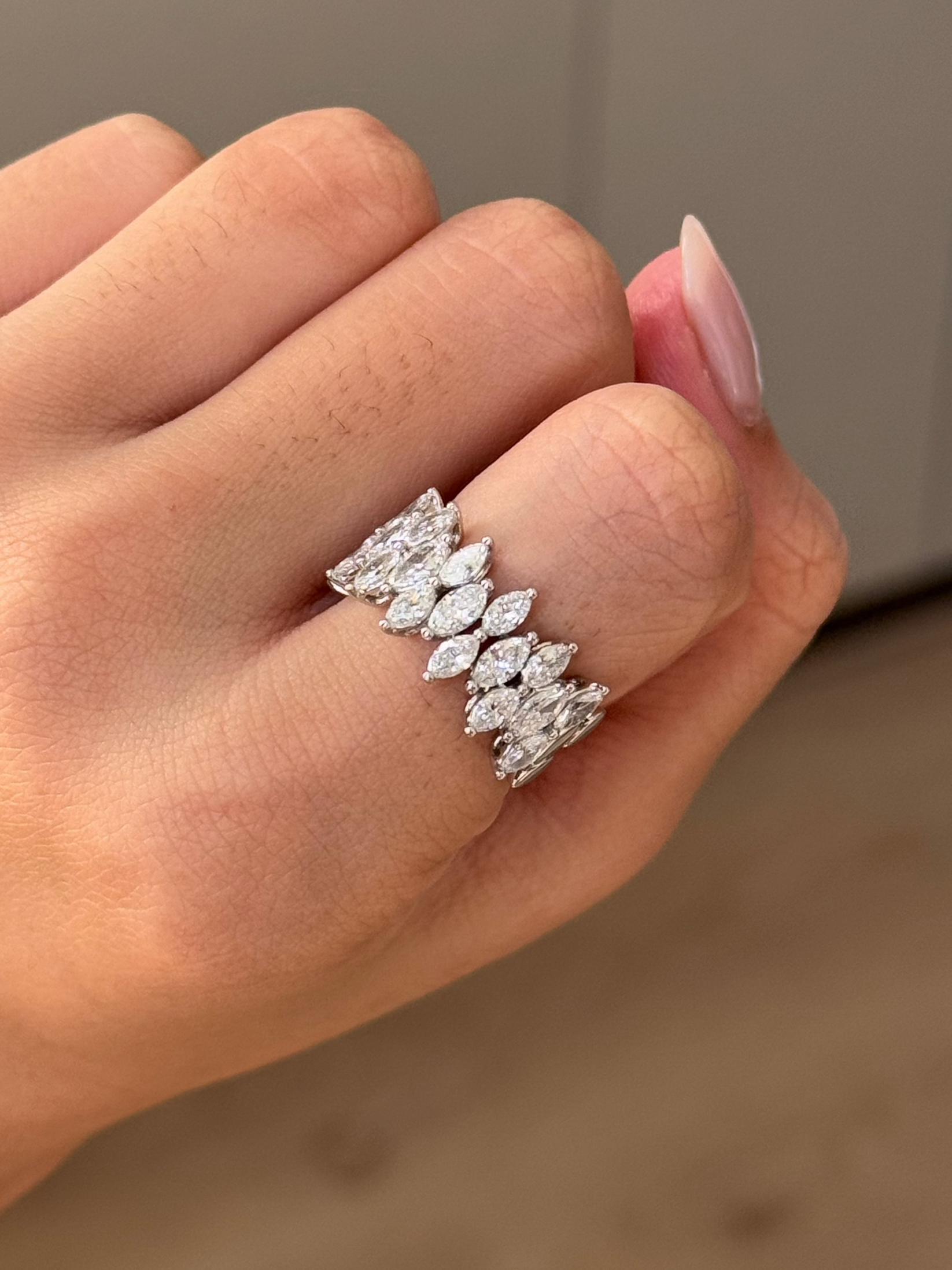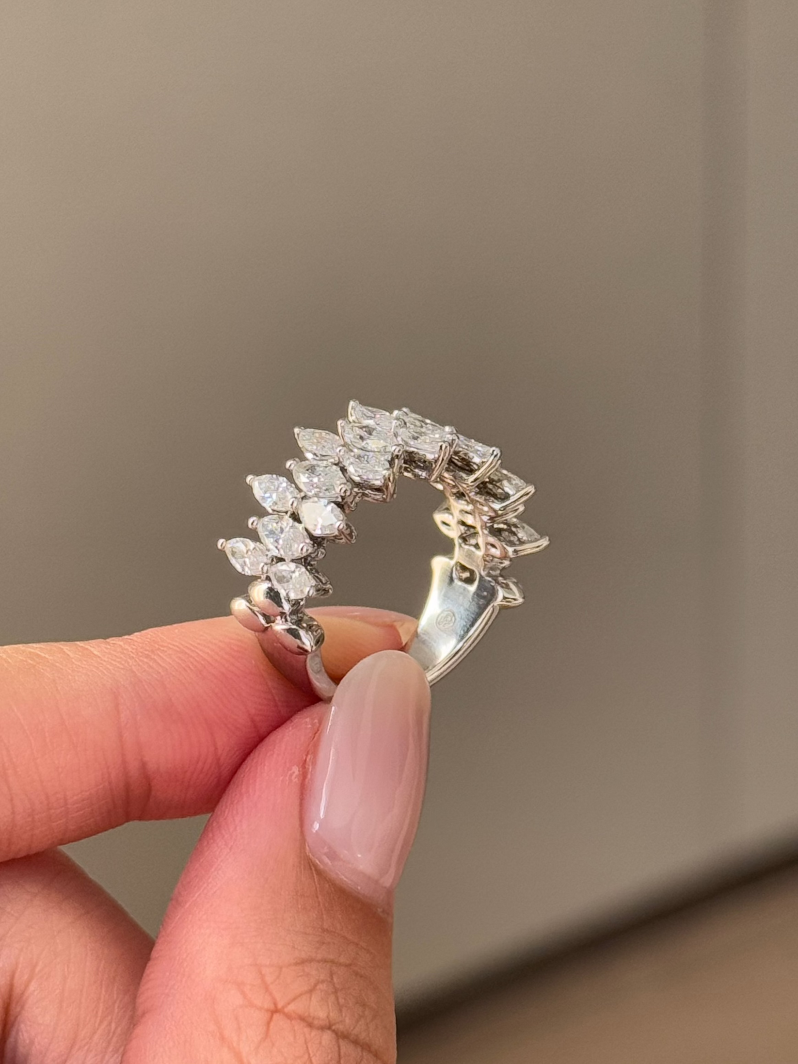 ✦ The Band Displayed in the Image Highlights a 2.12 TCW Marquise Cut CVD Diamond Half Eternity Wedding Band.