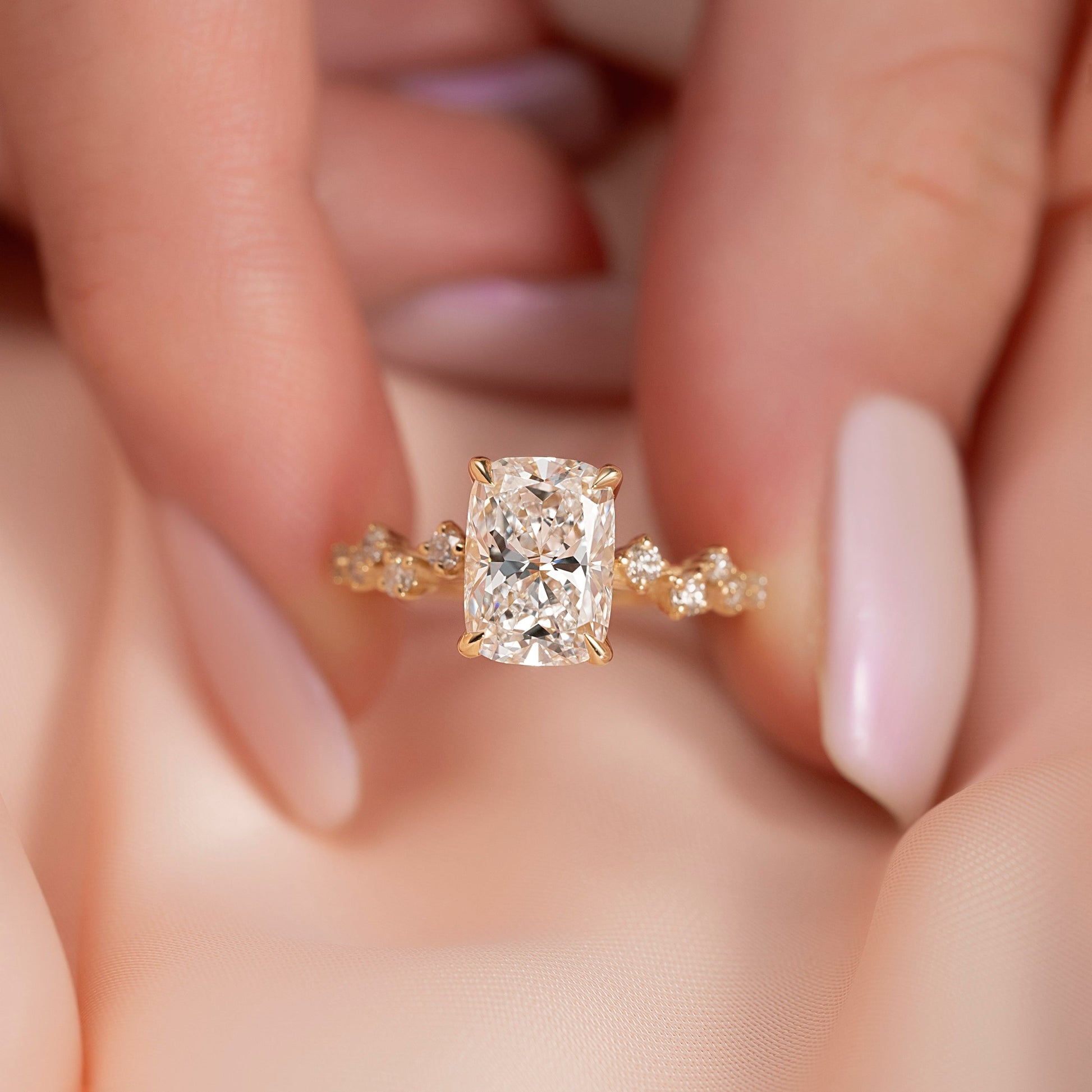 ✦ Cherish your love story with this captivating Cluster ring, centered around a 2 - 2.5 CT Elongated Cushion Moissanite that shimmers with brilliance.