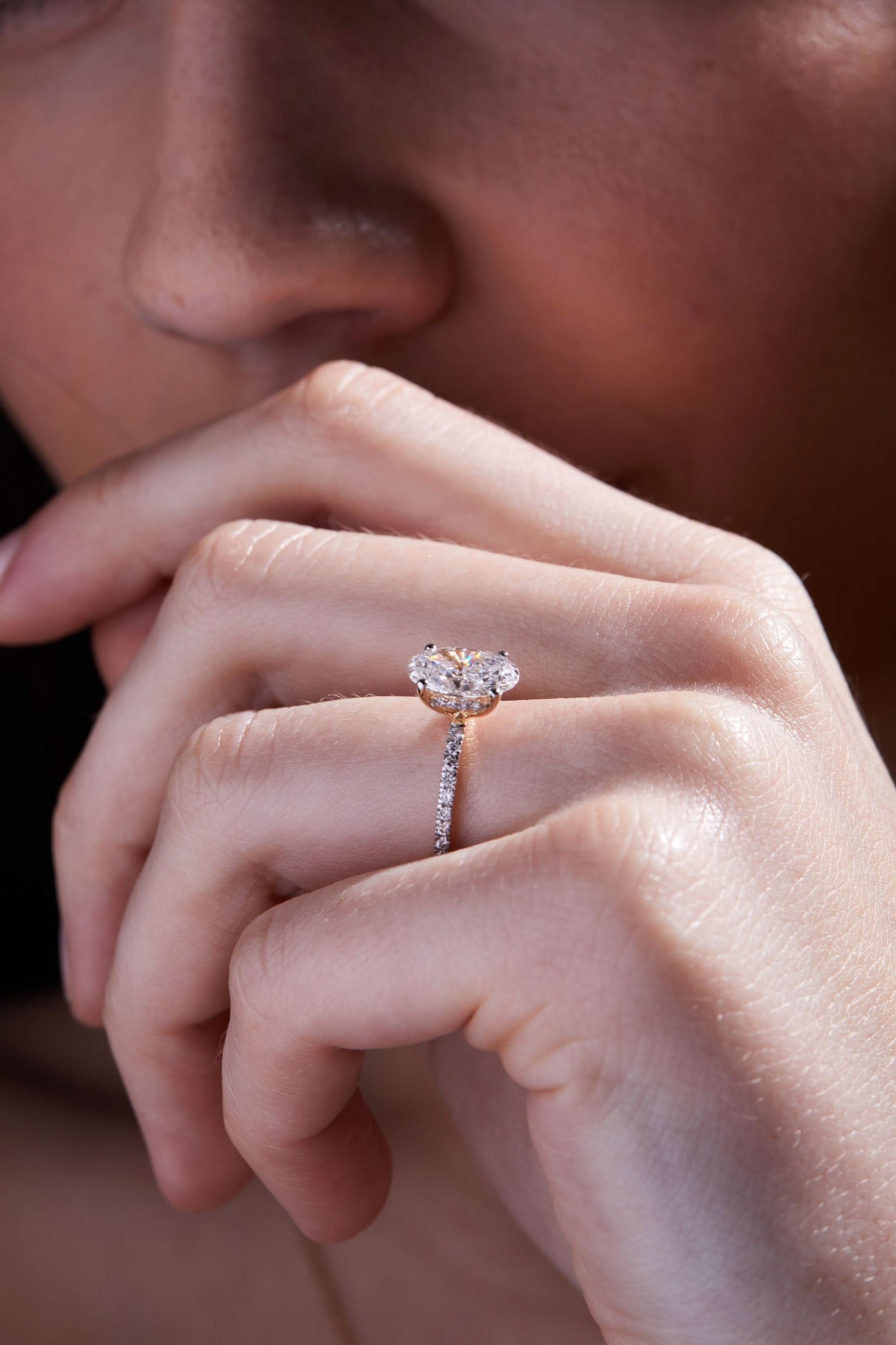 ✦ Cherish your love story with this captivating Hidden Halo & Pave ring, centered around a 2 CT Oval Moissanite that shimmers with brilliance.