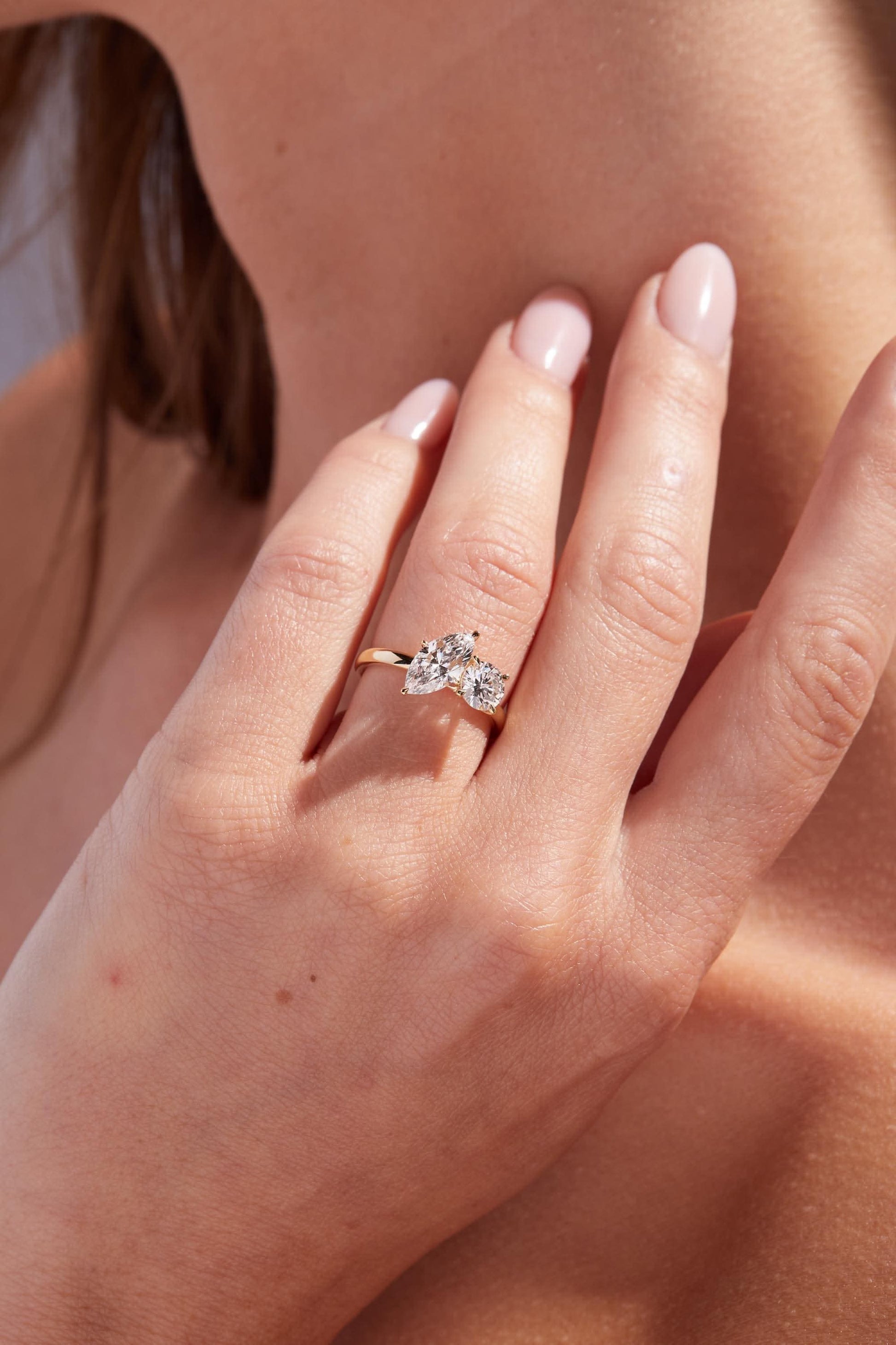 ✦ Cherish your love story with this captivating Two Stone ring, centered around a 2 TCW Marquise & Round Moissanite that shimmers with brilliance.