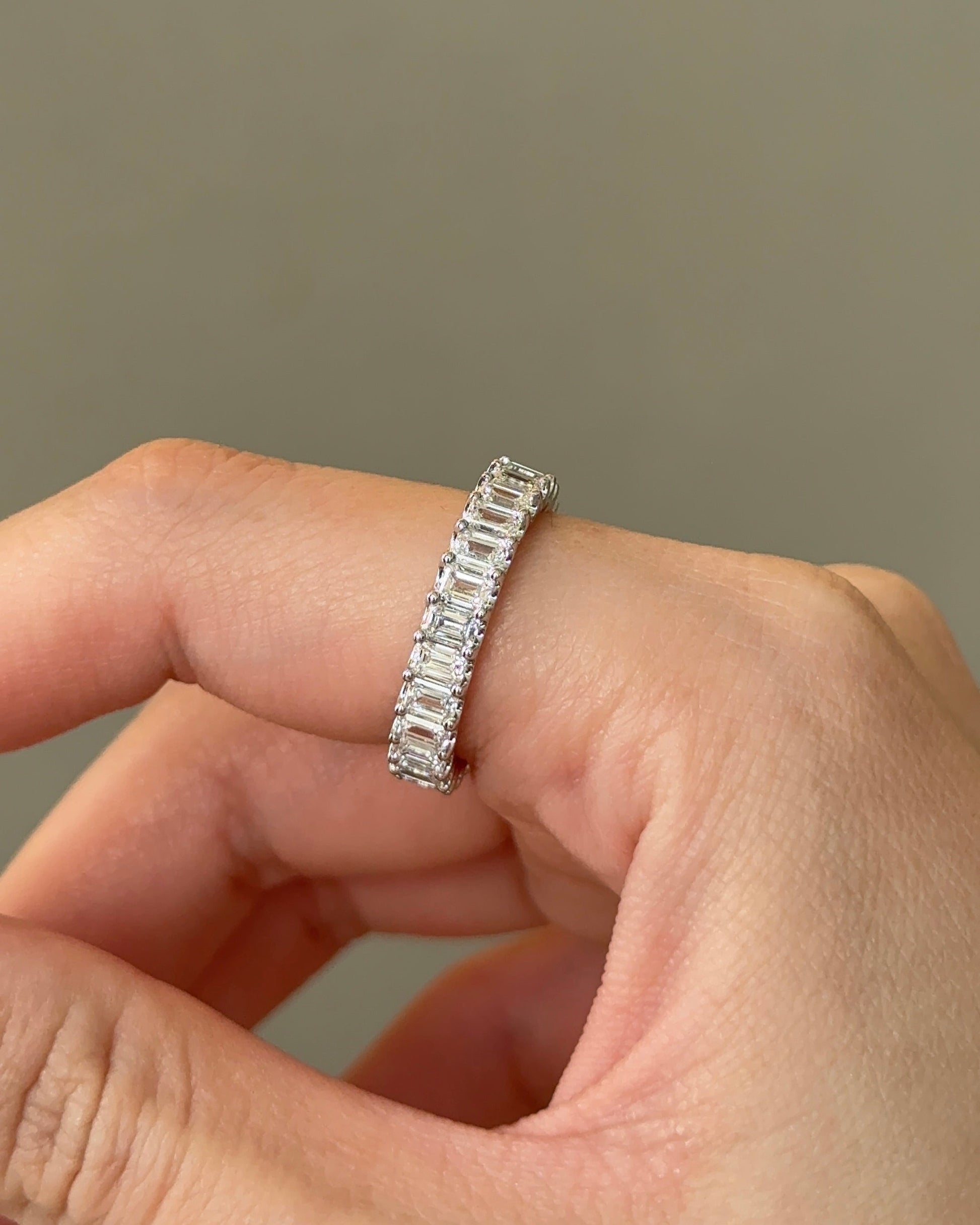 ✦ The Band Displayed in the Image Highlights a 3.72 TCW Emerald CVD Diamond Full Eternity Wedding Band.
